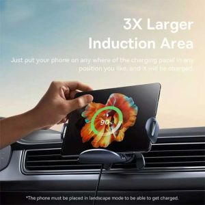 این هولدر از فناوری شارژ وایرلس Qi با حداکثر توان 15 وات پشتیبانی میکند. با استفاده از سه هسته شارژ وایرلس، این محصول پوشش وسیعی دارد و گوشی شما در هر حالتی که قرار دهید، بهسرعت شارژ میشود. توجه داشته باشید که برای گوشیهای آیفون، حداکثر توان خروجی 7.5 وات است.