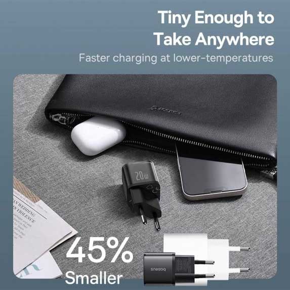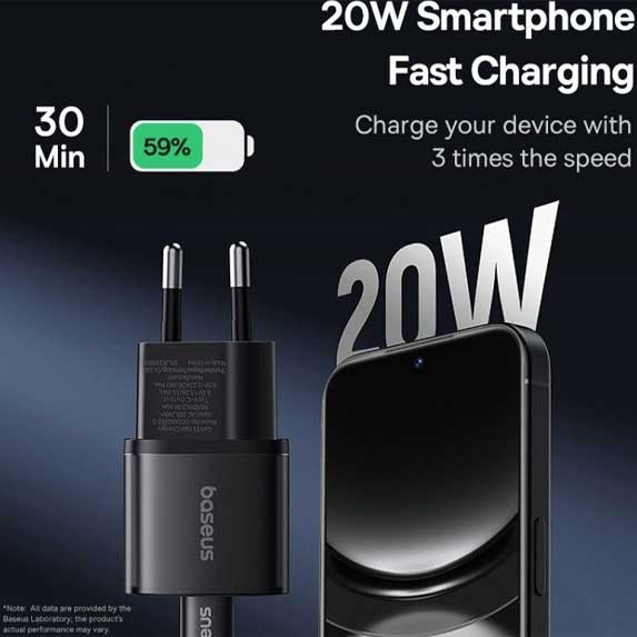 آداپتور شارژر فست شارژ Baseus GAN5 1C 20W یک شارژر دیواری فشرده و پرتوان است که با بهرهگیری از تکنولوژی پیشرفته GaN5S، امکان شارژ سریع و ایمن دستگاههای شما را فراهم میکند. این محصول با پروتکل Power Delivery (PD) سازگار است و میتواند تا سه برابر سریعتر از شارژرهای معمولی 5 وات، انرژی مورد نیاز گوشی شما را تامین نماید.