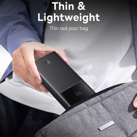با ابعاد 150.3 در 69.0 در 27.9 میلی‌متر و وزن مناسب، این پاوربانک به راحتی در کیف یا کوله‌پشتی جای می‌گیرد. طراحی بدنه هم کاربردی است و هم از دستگاه در برابر ضربات جزئی محافظت می‌کند.