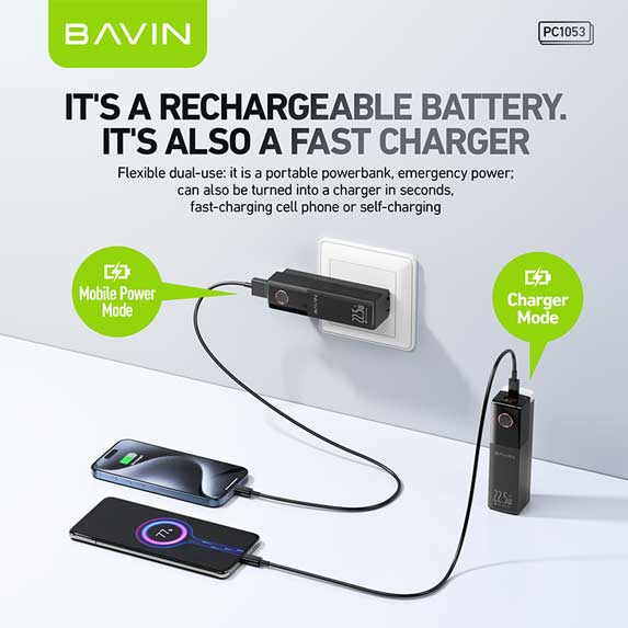 شارژر دیواری و پاوربانک Bavin PC1053 با ترکیب قابلیتهای متنوع، طراحی قابل حمل و عملکرد قابل اعتماد، انتخاب مناسبی برای استفاده روزمره، سفرها و شرایط اضطراری به شمار میرود.