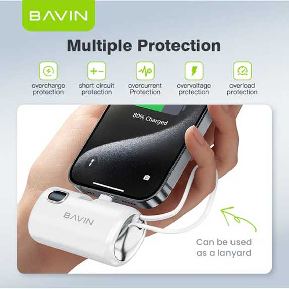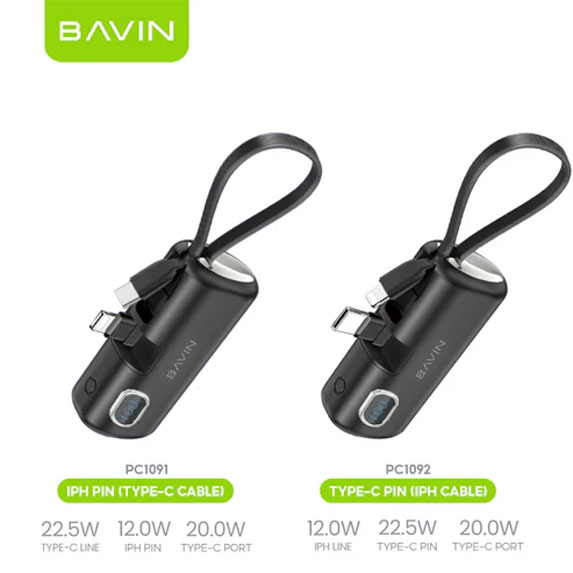 یکی از ویژگیهای برجسته پاوربانک Bavin PC109s ، طراحی بسیار کوچک و سبک آن است که علاوه بر کابل تایپ سی، یک پورت لایتنینگ تاشو نیز برای آن در نظر گرفته شده است. ابعاد این پاوربانک بسیار جمع و جور است که حمل آن را بسیار آسان کرده و به راحتی در جیب یا کیف جای میگیرد.