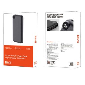 پاوربانک Biva BP-011 با وزن 221 گرم، ظرفیتی اسمی معادل 10000 میلیآمپرساعت دارد. لازم به ذکر است که ظرفیت واقعی و موثر این پاوربانک تحت شرایط استاندارد، حدود 5600 میلیآمپرساعت اعلام شده است. از این پاوربانک میتوان برای شارژ تلفن همراه، تبلت، ساعت هوشمند و هندزفری بلوتوث استفاده کرد. بدنه این محصول از ترکیب مستحکم ABS و پلیکربنات ساخته شده که دوام و کیفیت بالایی را تضمین میکند. نمایشگر دیجیتال تعبیهشده روی دستگاه، میزان دقیق شارژ باقیمانده را به درصد نشان میدهد.