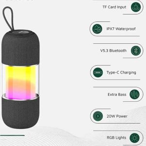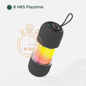 این اسپیکر با ترکیبی از مواد ABS، سیلیکون و پارچه طراحی شده که علاوه بر ظاهر جذاب، مقاومت بالایی در برابر ضربه و شرایط محیطی دارد. اندازه جمعوجور و وزن مناسب آن، حمل و نقل را آسان میکند.