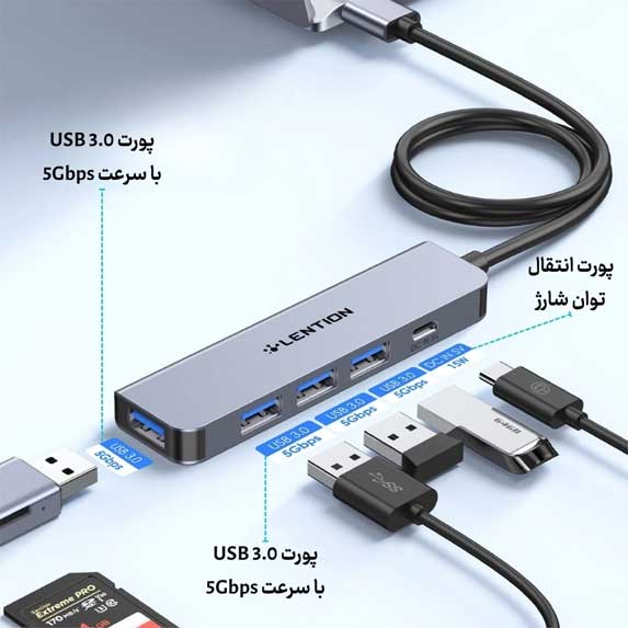 اگر به دنبال یک هاب USB هستید که هم سرعت انتقال داده‌های شما را افزایش دهد و هم ظاهری شیک و مدرن به میز کارتان ببخشد، هاب 5 پورت HE32 USB-A گزینه‌ای ایده‌آل است. این هاب با چهار پورت USB 3.0 و یک پورت اختصاصی برای شارژ، نیازهای مختلف کاربران را به طور کامل پوشش می‌دهد. هر یک از پورت‌های USB 3.0 این هاب قادر به انتقال داده‌ها با سرعت خیره‌کننده‌ی 5 گیگابیت بر ثانیه هستند، که این سرعت تقریباً 10 برابر بیشتر از استاندارد قدیمی USB 2.0 است. این ویژگی به شما امکان می‌دهد فایل‌های حجیم مانند فیلم‌های HD، عکس‌های با کیفیت بالا و فایل‌های طراحی را در کمترین زمان ممکن انتقال دهید.