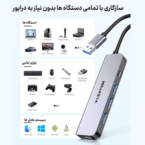 یکی از مزایای برجسته‌ی این هاب، سازگاری کامل آن با تمامی سیستم‌عامل‌های رایج از جمله ویندوز، مک‌اواس، لینوکس و حتی سیستم‌عامل‌های موبایلی مانند اندروید و iOS است. این یعنی شما بدون نیاز به نصب هیچ گونه درایور یا نرم‌افزار اضافی، می‌توانید بلافاصله پس از اتصال هاب به دستگاه خود، از تمامی قابلیت‌های آن استفاده کنید. این ویژگی به خصوص برای کاربرانی که به دنبال راه‌اندازی سریع و بی‌دردسر هستند، بسیار ارزشمند است.