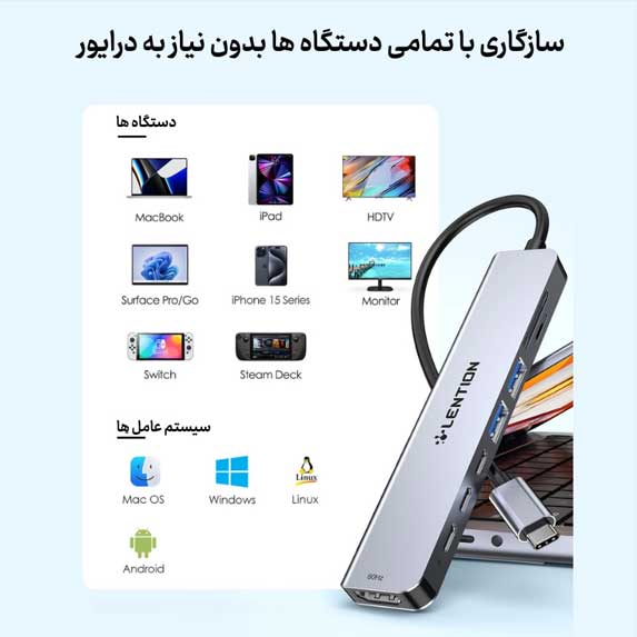 *سازگاری با همه سیستمعاملها*: این هاب بدون نیاز به نصب درایور قابل استفاده است. این یعنی که با انواع دستگاهها و سیستمعاملها سازگار است و برای کاربرانی که از دستگاههای مختلف استفاده میکنند، بسیار کارآمد است.