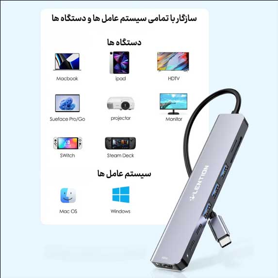 این هاب با دستگاههای مختلف مثل MacBook Pro، MacBook Air، iMac، Surface Pro و Chromebook سازگار است.