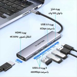 هاب 6 پورت CH17 یک هاب کاربردی و باکیفیت است که برای استفاده روزمره طراحی شده است. این هاب دارای 6 پورت متنوع شامل یک پورت ورودی USB-C، یک پورت خروجی HDMI با پشتیبانی از کیفیت 4K و نرخ تازهسازی 30 هرتز، سه پورت USB 2.0، یک پورت USB 3.0 و یک پورت Type-C برای شارژ است. این ویژگیها به شما امکان میدهند تا دستگاههای مختلف را به هاب متصل کرده و دادهها را با سرعت مناسب انتقال دهید. همچنین، پورت شارژ این هاب با پشتیبانی از خروجی 100 واتی PD3.0، امکان شارژ سریع و کارآمد دستگاههای شما را فراهم میکند.