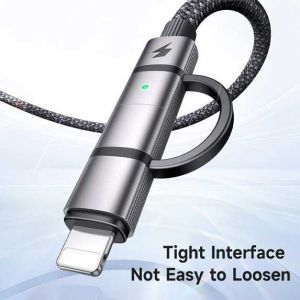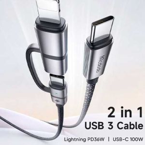این کابل از قابلیتهای شارژ سریع و انتقال داده پشتیبانی میکند. در یک سر آن، کانکتور Type-C و در سر دیگر، دو کانکتور Type-C و لایتنینگ با بدنه آلومینیومی قرار دارد که دوام و کیفیت بالایی را تضمین میکند. بدنه کابل از الیاف بافتهشده ساخته شده که علاوه بر ظاهر زیبا، مقاومت بالایی در برابر خمش و ساییدگی دارد. طول کابل 1.2 متر است و میتواند دادهها را با حداکثر سرعت 1 گیگابایت بر ثانیه انتقال دهد.