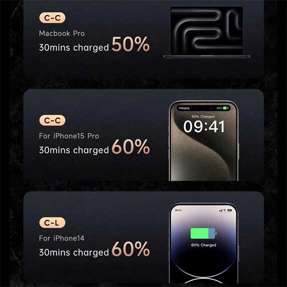 - شارژ آیفون 14 تا 60 درصد در تنها 30 دقیقه با توان 36 وات (از طریق پورت لایتنینگ).