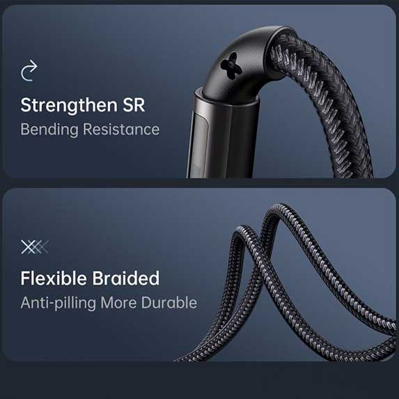 - جنس نایلون بافتهشده، TPE، و آلیاژ روی برای مقاومت در برابر کشیدگی، خمیدگی، و پارگی.