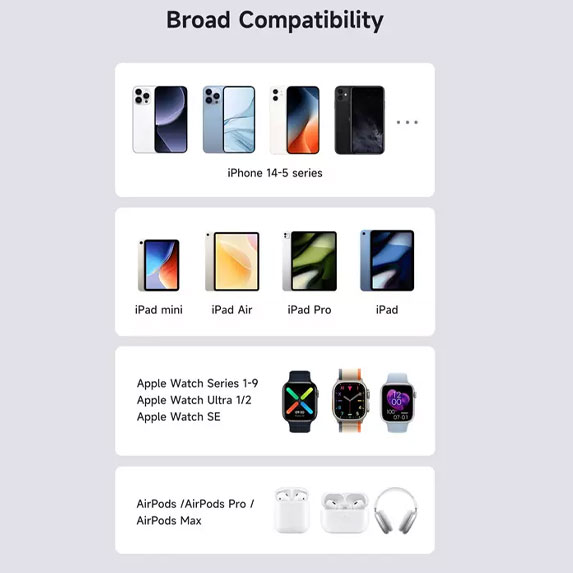 این محصول با ترکیب هوشمندانه کابل و پایه شارژ وایرلس، تجربه کاربری سادهتر و کارآمدتری را برای دارندگان دستگاههای اپل فراهم میکند. طراحی جمعوجور آن باعث میشود به راحتی در کیف یا جیب جای بگیرد و همیشه همراه شما باشد.