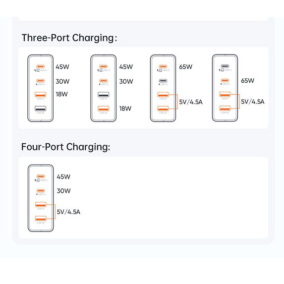 2. در صورت استفاده همزمان از همه پورتها، توان به صورت زیر تقسیم میشود: