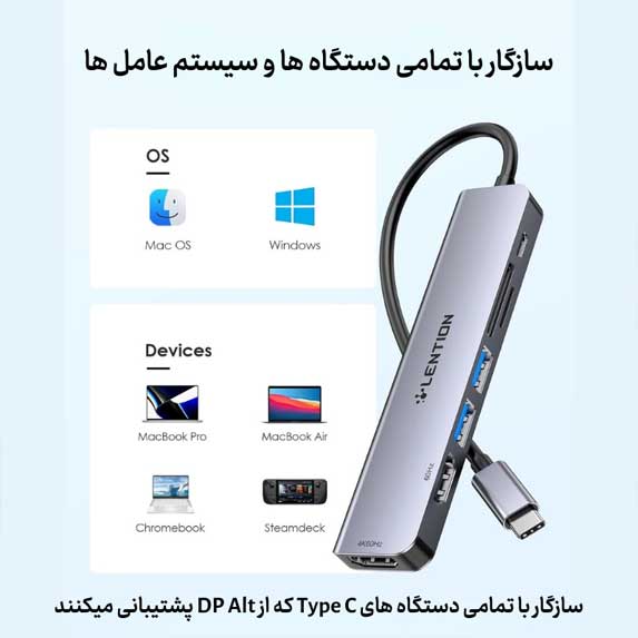 *سازگاری گسترده*: این هاب با دستگاههای مختلفی مانند مکبوک، لپتاپهای ویندوزی، گوشیهای هوشمند و تبلتها سازگار است و تجربه کاربری بینقصی ارائه میدهد.